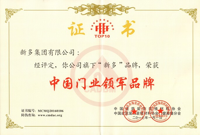 2017年1月11日,由中國(guó)門窗幕墻行業(yè)協(xié)會(huì)主辦的“2016中國(guó)門窗幕墻行業(yè)年會(huì)”在北京人民大會(huì)堂隆重舉行,新多集團(tuán)憑借強(qiáng)大的集團(tuán)實(shí)力及品牌形象獲得組委會(huì)的高度肯定,榮獲“中國(guó)門業(yè)領(lǐng)軍品牌”榮譽(yù)稱號(hào)。
