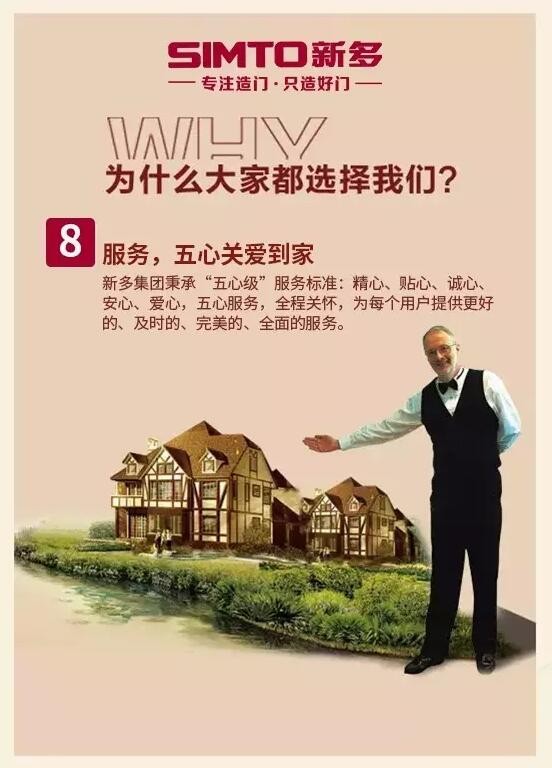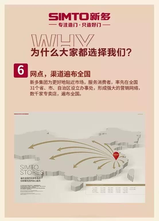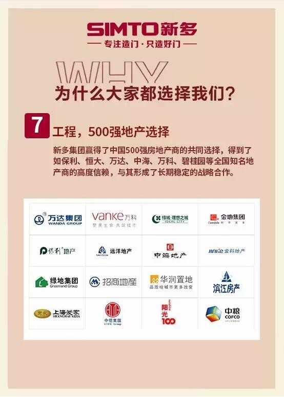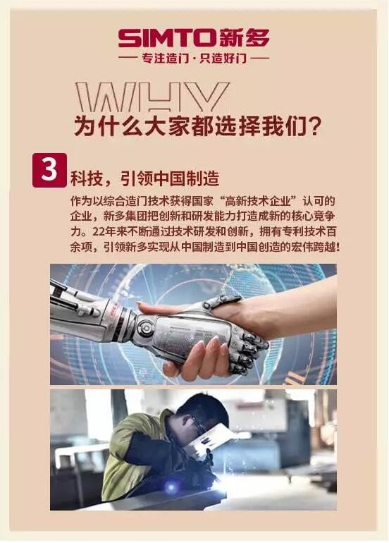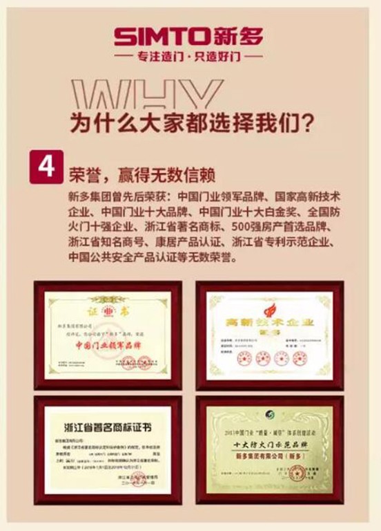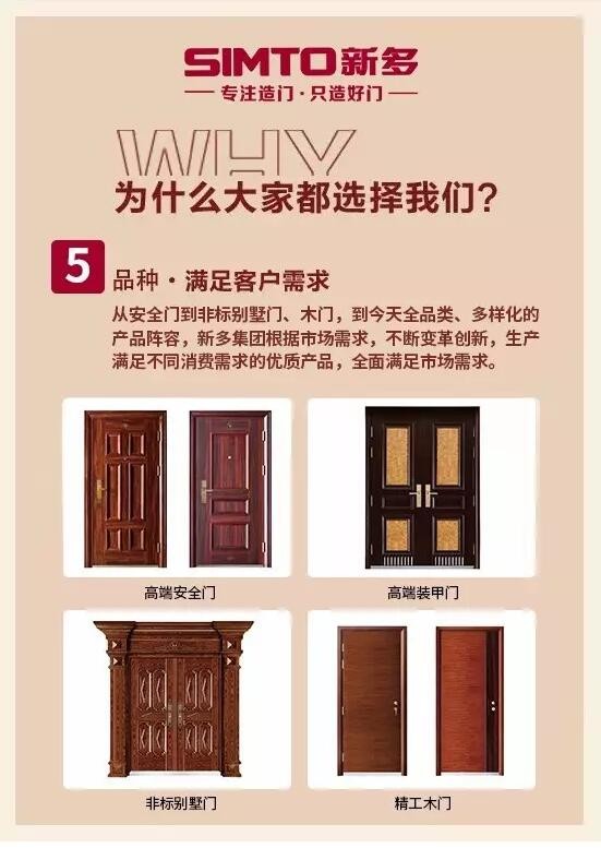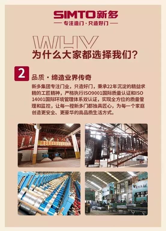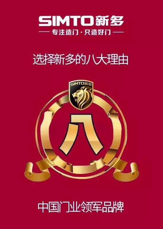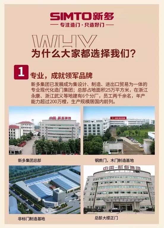新多集團(tuán)位于“中國門都”之稱的浙江永康,創(chuàng)建于1995年,1998年升級為新多集團(tuán)。歷經(jīng)22年的發(fā)展,新多已成為集設(shè)計、制造、進(jìn)出口貿(mào)易為一體的專業(yè)現(xiàn)代化造門集團(tuán),總部占地面積25萬平方米,在浙江永康、浙江武義建有6個分廠,注冊資金1億元,固定資產(chǎn)12億元,員工兩千余名,年產(chǎn)能力超過200萬樘。產(chǎn)品涵蓋了高端安全門、高端別墅大門、精工木門、高端裝甲門、防火門、樓宇門、智能安防系統(tǒng)等7大類產(chǎn)品?!靶露嚅T”也因其精湛的工藝、完美的品質(zhì),成為國內(nèi)高品質(zhì)門、防盜門品牌的代名詞。新多集團(tuán)以領(lǐng)先業(yè)界的品牌優(yōu)勢和精益求精的卓越品質(zhì),成為中國門業(yè)令人仰望的行業(yè)標(biāo)桿。
