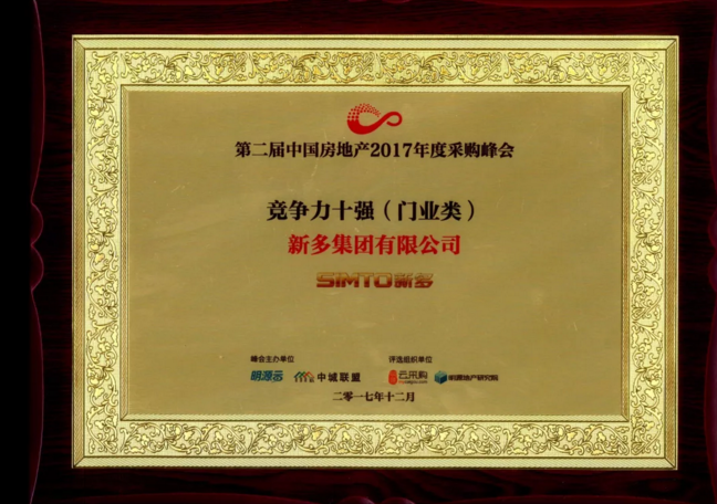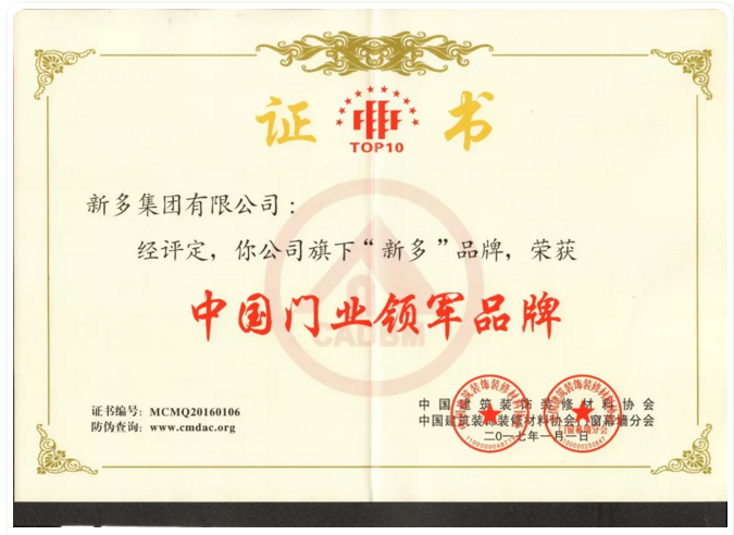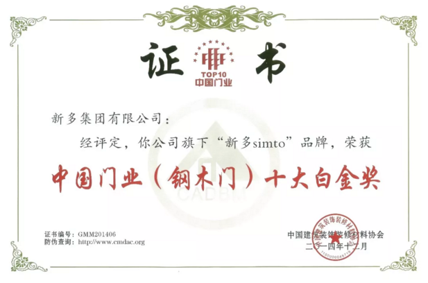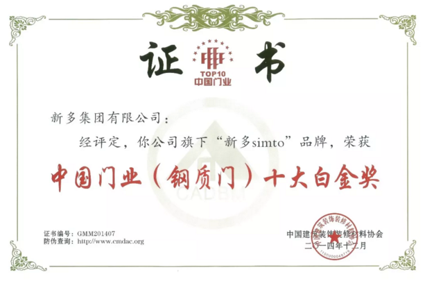 新多榮獲“中國(guó)門(mén)業(yè)(鋼質(zhì)門(mén))十大白金獎(jiǎng)”、“中國(guó)門(mén)業(yè)(鋼木門(mén))十大白金獎(jiǎng)”。