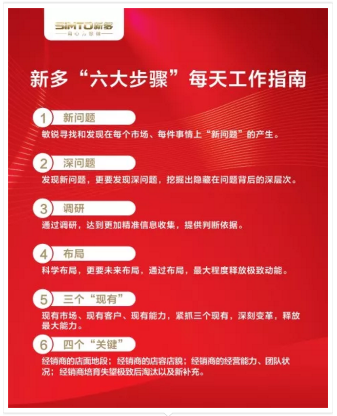 從新聚變,追夢(mèng)2019,在這一年新多將全面貫徹落實(shí)“六個(gè)步驟”管理升級(jí),持續(xù)優(yōu)化產(chǎn)品結(jié)構(gòu),立體化渠道拓寬,提升服務(wù)質(zhì)量等品牌戰(zhàn)略部署,未來(lái),新多將以嶄新姿態(tài),凝心聚力,創(chuàng)新變革。