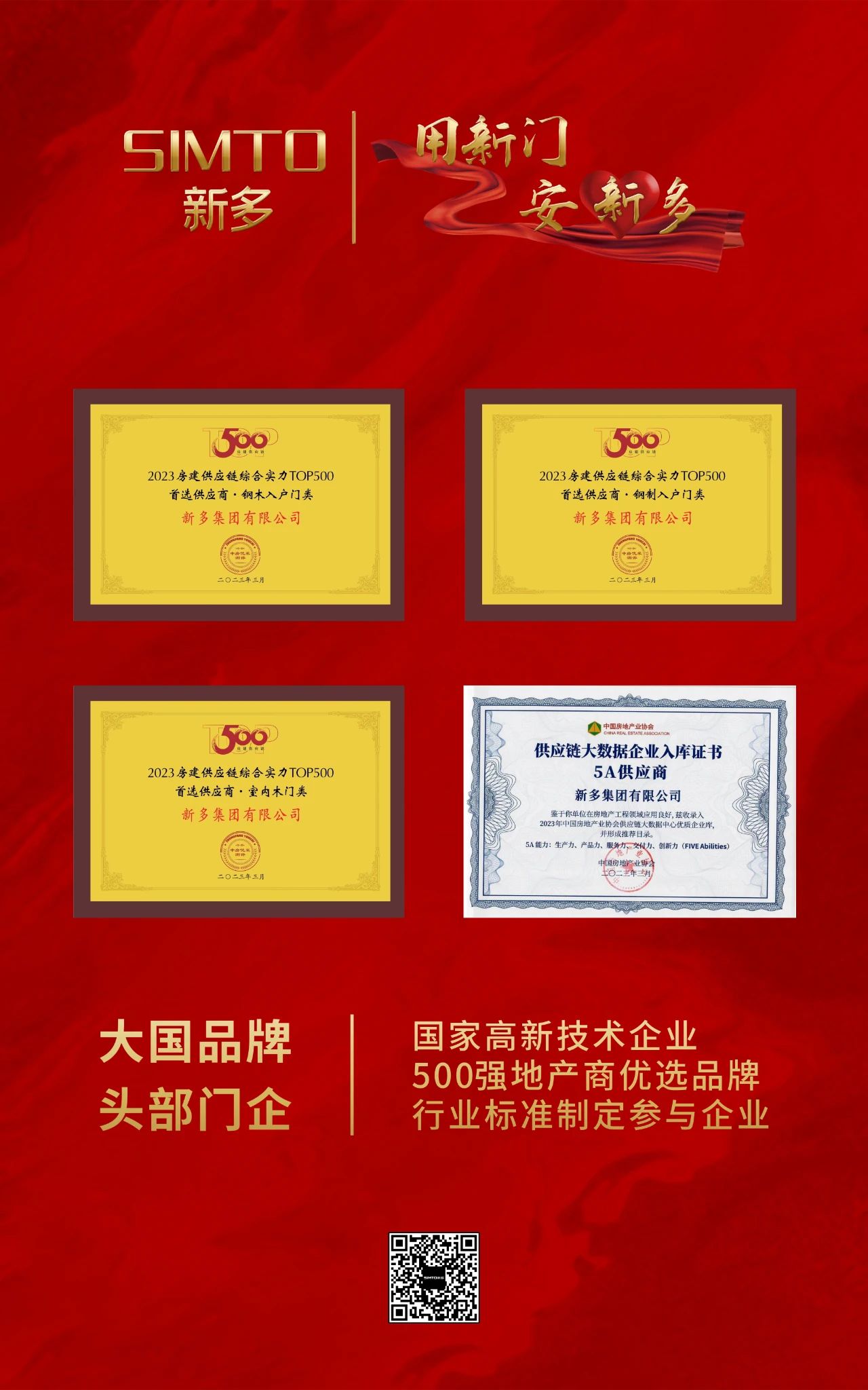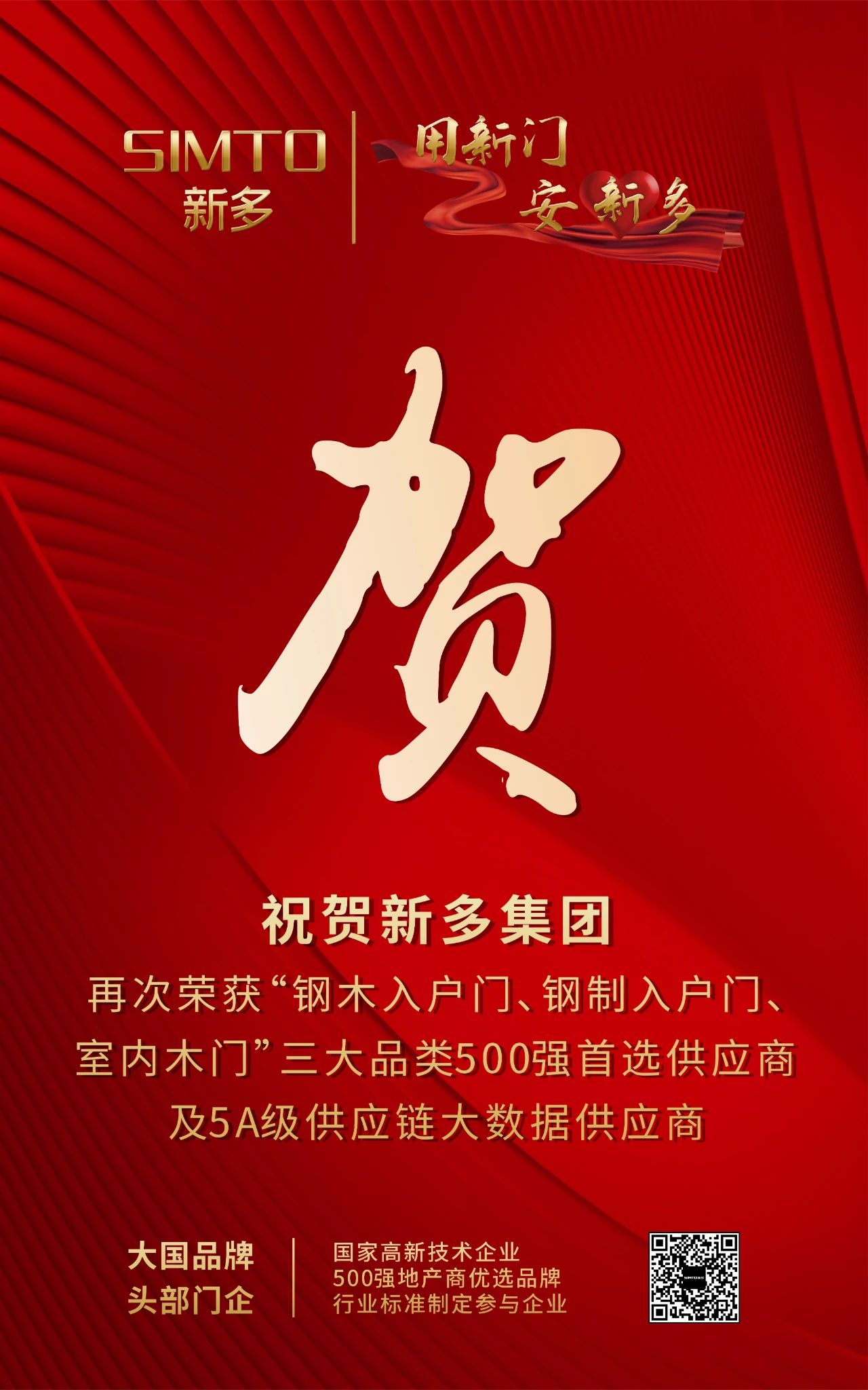 祝賀新多集團(tuán)再次榮獲“鋼木入戶門、鋼制入戶門、室內(nèi)木門”三大品類500強(qiáng)首選供應(yīng)商及5A級供應(yīng)鏈大數(shù)據(jù)供應(yīng)商